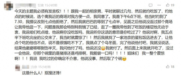 我是下午6点下班,他当时约到了7.30,我提议改到七点他拒绝了,然后我就巴巴的等到了七点半,见面之后他说没逛过那个商场让我带他逛一下,问题是我那会特别特别饿了已经,逛了一圈我带他到了吃饭的楼层他无动于衷,我说咱们吃点啥,他说啊你没吃饭吗,我说听你这话的意思是你吃过了?他说对啊,我五点半下班吃完坐的公交来了,我当时就震惊了!!